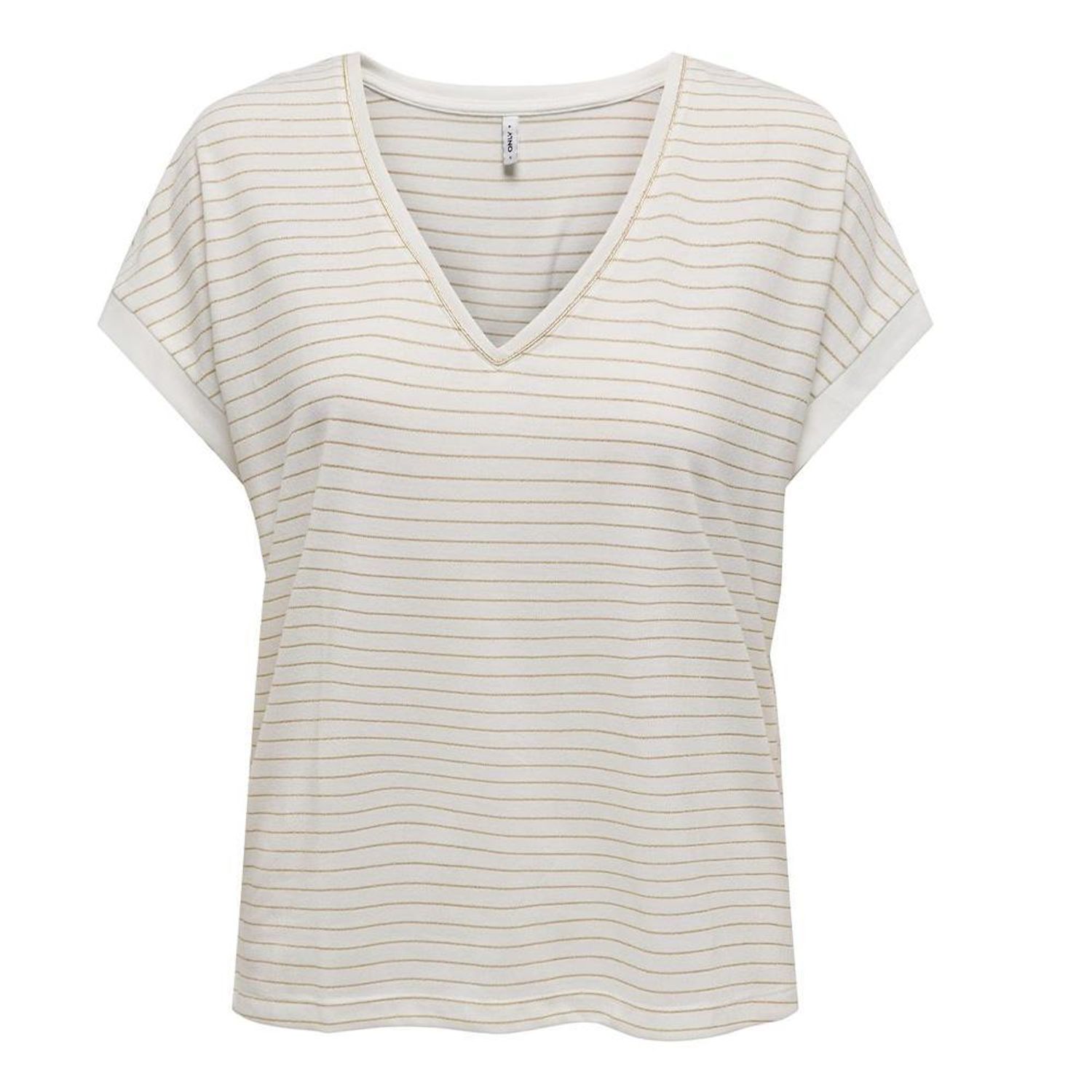 Optez pour ce t-shirt Only à prix bas !- Coloris : Blanc, Doré- Col V- Manches courtes- Composition : 70% polyester, 28% viscose, 2% fibres métalliques