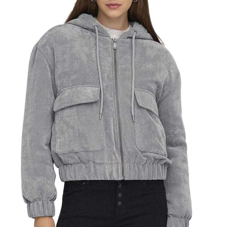 Craquez pour la veste femme Only !Coloris : GrisTissu veloursCapucheFermeture à zipManches longuesCoupe courteComposition : 92% Polyester recyclé, 8% Polyamide