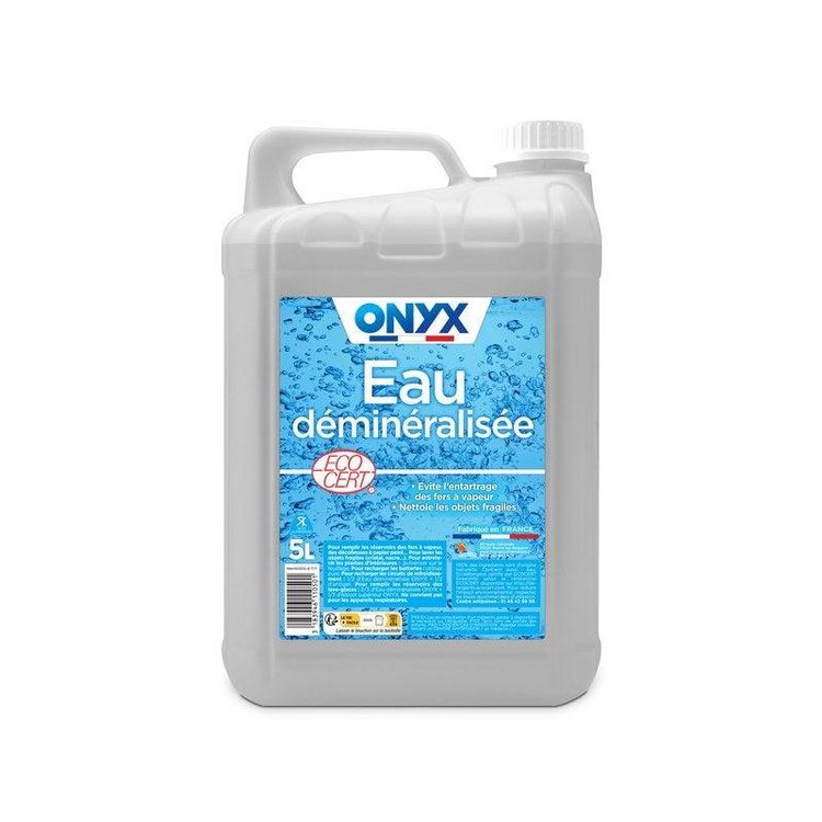 - Conseil d'utilisation : Avant toute utilisation, lisez l'étiquette et les informations concernant le produit. Pour laver les objets fragiles en nacre: Tremper l'objet dans de l'eau déminéralisée et du savon, rincer avec cette eau puis lustrer avec un chiffon sec légèrement enduit d'huile de vaseline Onyx. Pour entretenir les plantes vertes d'intérieur: Pulvériser de l'eau déminéralisée sur le feuillage des plantes. Pour recharger les batteries : verser l'eau déminéralisée pure dans la batterie. Pour recharger les circuits de refroidissement: Mélanger 50% d'eau déminéralisée avec 50% d'antigel. Pour remplir les réservoirs des lave-glaces automobiles: Mélanger 2/3 d'eau déminéralisée avec 1/3 d'alcool ménager supérieur Onyx, puis verser dans le réservoir de lave-glace de votre véhicule.