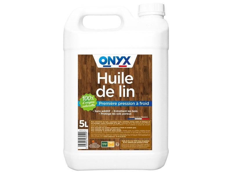 Nom du produit : Huile de linMarque du produit : ONYXContenance : 5LConseil d'utilisation : Avant toute utilisation, lisez l'étiquette et les informations concernant le produit. Pour entretenir les bois, carrelages bruts, tomettes, tuiles, terres cuites et dallages: Mélanger 50 à 75% d'huile de lin