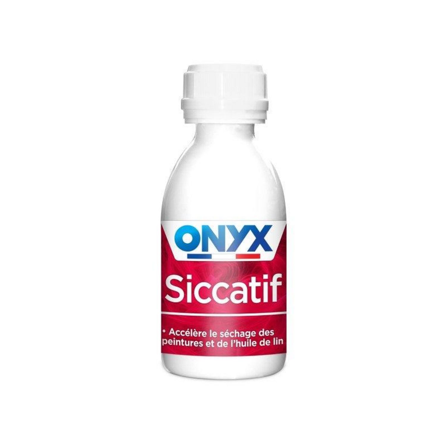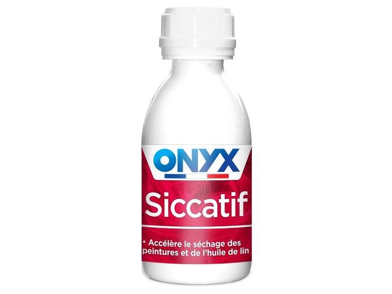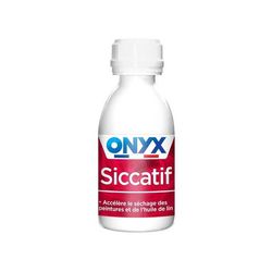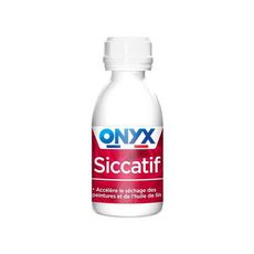 Nom du produit : SiccatifMarque du produit : ONYXContenance : 190 mlConseil d'utilisation : Avant toute utilisation, lisez l'étiquette et les informations concernant le produit. Pour accélérer le séchage des peintures solvantées : Ajouter 1 à 2 cuillères à soupe de Siccatif Onyx par litre de peintu