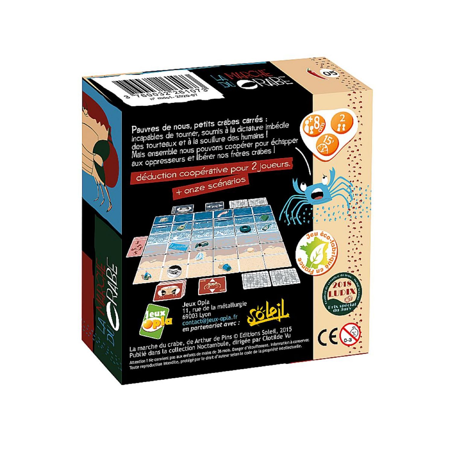 La Marche du Crabe est un jeu de déduction coopérative dans lequel les deux crabes joueurs dépendront complètement l'un de l'autre? Sans parler ! A votre tour de jeu, il suffit de placer une nouvelle carte « vilain » judicieusement en essayant de communiquer, par vos choix, des informations sur les zones dangereuses de la plage, puis, si vous le souhaitez, vous pouvez déplacer le duo de crabe. Un joueur ne se déplace que verticalement sur la plage et l'autre uniquement horizontalement. Un jeu évolutif ! Au début il s'agit juste de sauver les autres crabes en évitant les tourteaux, puis, éviter les homards, les phobies sur certains objets, les raies qui aident ou pas, les cailloux ? Et le tout avec une réserve de crevettes de sauvegarde limitée.