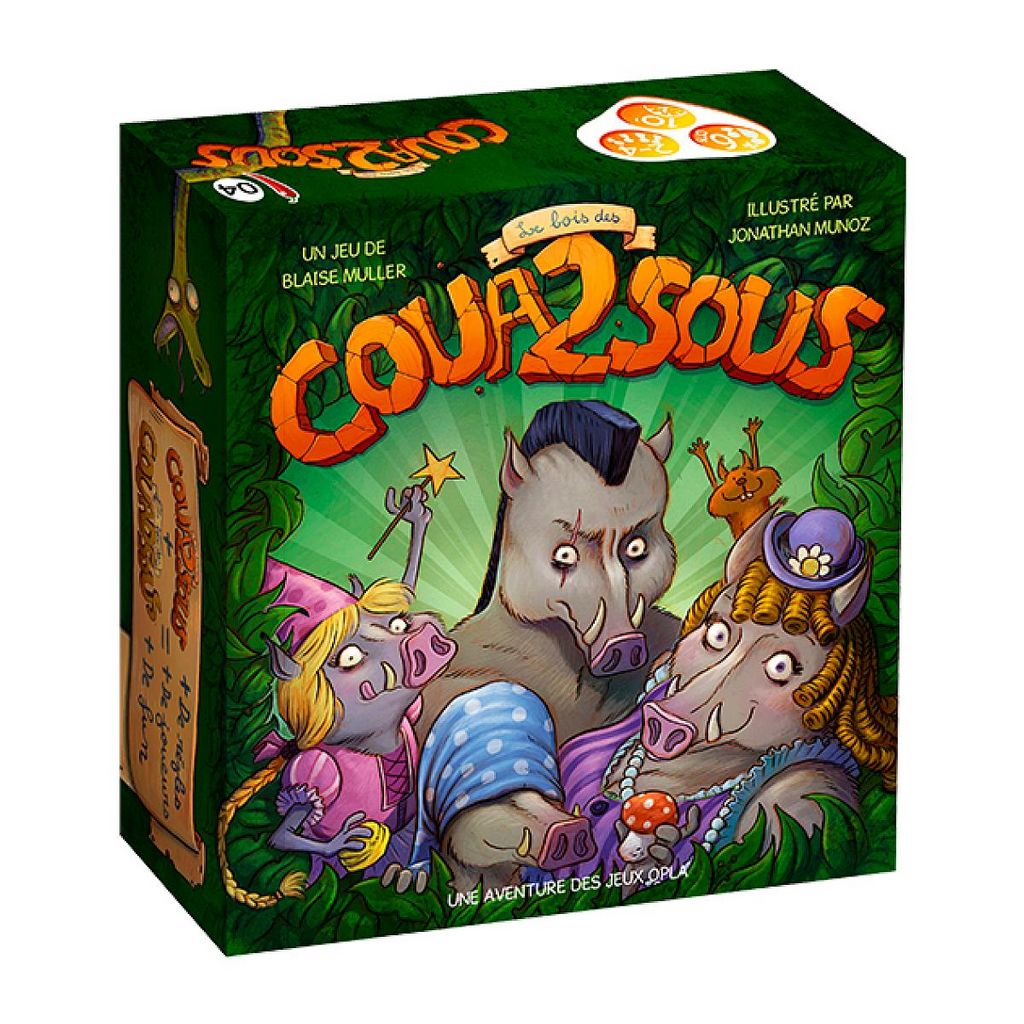 Le Bois des Coua2sous propose la même mécanique de jeu que son grand frère Le Bois des Couadsous, dans un nouveau décor et avec de nouveaux personnages : les Sangliers sont arrivés ! Ainsi, ceux qui n'ont pas le jeu peuvent choisir lequel ils préfèrent, et? Ceux qui ont les deux jeux auront de nouvelles et riches perspectives de jeu ! L'auteur Blaise Muller et l'éditeur Florent Toscano se sont attachés à développer des variantes qui renouvellent considérablement l'expérience de jeu en gardant l'ADN du jeu de base et sans le dénaturer ! En effet, chacun des deux jeux se transforme en une extension pour l'autre !