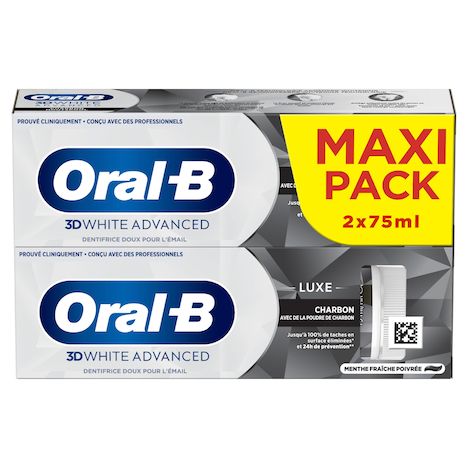 oral-b, 3dwhite, advanced, luxe, dentifrice, blancheur, technologie, charbon, surface, taches, fluorure, émail, protège, protection, prévention, blanchit, brosse, cliniquement, professionnel, recyclable, dentifrice, nettoyage, propre,3d white