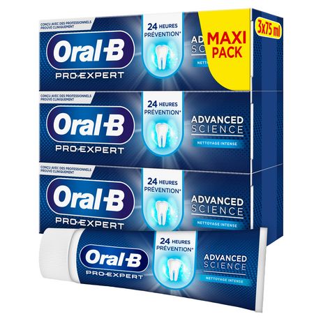 Le dentifrice Oral-B Pro-Expert Advanced Science Nettoyage intense est conçu par des professionnels & cliniquement prouvé : il stoppe les problèmes avant qu'ils ne commencent, en aidant à prévenir les effets de la plaque bactérienne et son adhérence aux dents & gencives pendant 24 heures lorsqu'il est utilisé deux fois par jour .