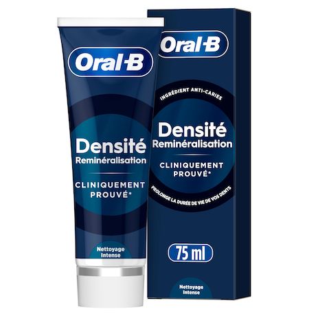 Le dentifrice Oral-B Clinical Densité Reminéralisation Nettoyage Intense prolonge la durée de vie des dents. Il reconstitue activement le déficit de calcium. La technologie unique au complexe de fluorure stanneux Oral-B offre une protection supérieure contre la perte future de l'émail due aux acides alimentaires par rapport à un dentifrice au fluor ordinaire, même entre les brossages. Utilisé deux fois par jour, il reconstitue le déficit de calcium en augmentant activement la densité de l'émail dans 2 zones critiques : à la surface de l'émail et le long du sillon gingival