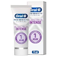 Le dentifrice Oral-B Pro 3D White Clinical Blancheur Intense est cliniquement prouvé pour des dents plus blanches en 1 jour en éliminant les taches en surface. C'est le meilleur dentifrice blancheur d'Oral-B avec sa technologie ionique unique : il désincruste les taches sans frotter, élimine les taches avec le blanchiment ionique, protège les dents contre l'apparition de nouvelles taches et convient aux dents sensibles.