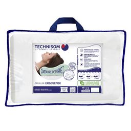 Oreiller ergonomique ERGOSENSE. L'oreiller se confome automatiquement à la morphologie de chaque utilisateur. L’architecture modulable exclusive en 3 épaisseurs permet d’ajuster la hauteur pour assurer le maintien idéal de la tête. Sa forme assure confort et détente des cervicales pour des nuits paisibles. Lavable en machine.