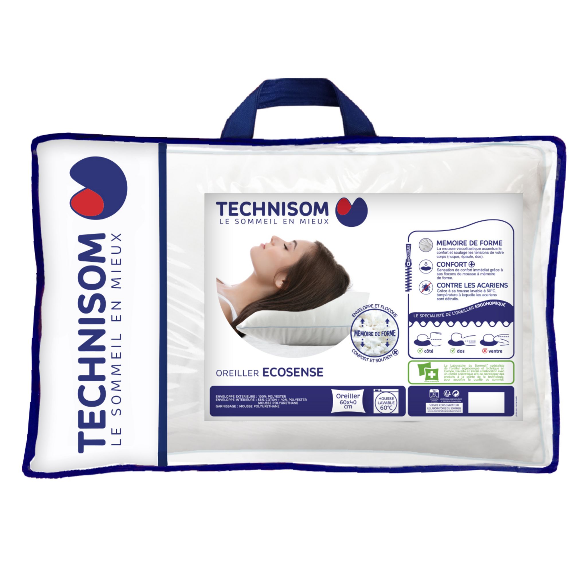 Oreiller moelleux à mémoire de forme ECOSENSE. Garni de flocons de mousse mémoire de forme, cet oreiller saura s'adapter parfaitement à votre sommeil et vous promets des nuits pleines de douceur. Son côté double face permet d'être utilisé été comme hiver.