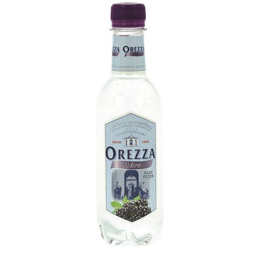 eau minérale gazeuse d'orezza 99.9% et arôme naturel de mure 0.1%