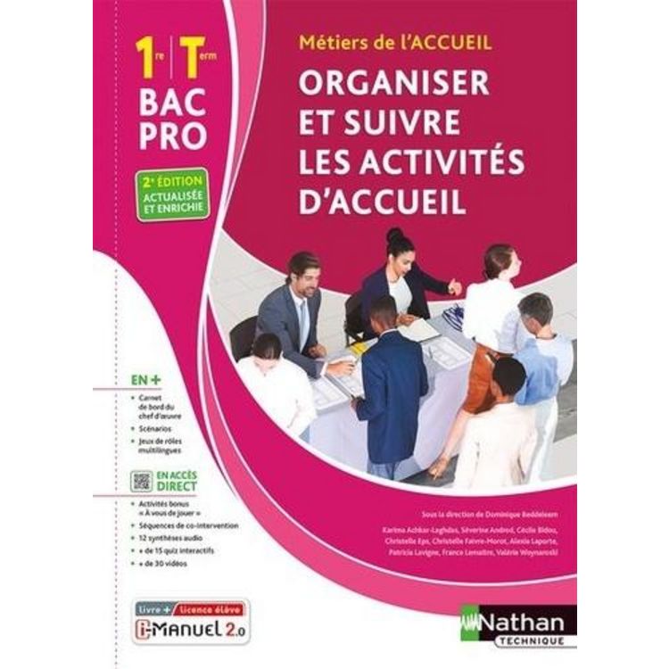 Cet ouvrage consommable est conforme au référentiel du Bac Pro Métiers de l'Accueil, et traite les activités gérées par le chargé d'accueil : gestion des prestations, gestion des projets... Toujours dans la même collection plébiscitée par les enseignants, il est proposé au choix en livre papier + licence numérique i-Manuel ou en 100% numérique i-Manuel. En version imprimée, cet ouvrage propose en complément une licence numérique i-Manuel 2. 0, la solution pour mettre les élèves en activité sur ordinateur ou sur tablette. >> Les infos pratiques sur le i-Manuel 2. 0 à découvrir ci-dessous Nouveau dans cette édition 2023 : - Une grille d'autoévaluation , à remplir au fur et à mesure, permet à l'élève de suivre sa progression. - Un dossier Conseils et outils pour la 1re/Tle est disponible en début d'ouvrage (créer son profil LinkedIn, rédiger son projet de formation motivé sur Parcoursup...). - Un carnet de bord du chef-d'oeuvre est proposé pour créer, suivre et présenter son projet à l'aide d'outils numériques. - Les missions ou applications qui font appel à des compétences Pix sont balisées. - En plus, accessibles par QR Codes : - Des activités bonus A vous de jouer pour favoriser l'animation de la alte (jeux de rôle en espagnol et en allemand, quiz, etc.) , - Des séquences complètes de co-intervention Français et Mathématiques , - Des questions supplémentaires qui font le lien avec le programme d'Economie-Droit , - Des synthèses audio et des quiz interactifs. Structure d'un dossier - Une vidéo pour introduire chaque dossier. - Des activités proposées sous forme de missions : - les élèves sont en situation dans des entreprises réelles ou réalistes de secteurs variés (tourisme, commerce, services à la personne, transports, banque, services publics...) , - des consignes sous forme de dialogue, mail, message écrit ou oral sont données par le tuteur pour mettre en oeuvre les compétences et les notions du dossier. - Une synthèse active adaptée à tous les types de mémorisation : schéma, audio, texte. - Des applications progressives pour retravailler les compétences dans de nouveaux contextes. Jeux de rôle multilingues Ils permettent d'entraîner les élèves à l'oral de manière ludique, avec la possibilité de piocher une carte billet d'humeur . Ils sont disponibles en français et en anglais dans l'ouvrage, et téléchargeables par QR Codes en espagnol et en allemand. Scénarios Ils permettent de croiser les compétences et de les travailler de manière active, par groupe, avec des supports informatiques et des travaux à réaliser oralement. Préparation à l'examen Une étude de cas sur les compétences du bloc 3 est proposée pour préparer l'épreuve écrite E2.