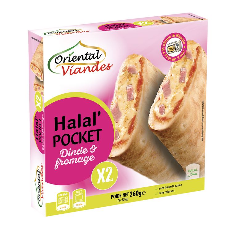 Pâte (50%) : farine de BLE, eau, fécule de POMME de terre, huile de tournesol, sel, sucre, GLUTEN de BLE, levures, poudres à lever : E450, E500, fibre de BLE. Garniture (50%) : sauce tomate (17%) (purée de tomate, eau, huile de tournesol, sel, sucre, épices et plantes aromatiques), Préparation à base de viande de dinde saumurée halal 13% : Viande de dinde halal (origine UE), eau, fécule de pomme de terre, gélifiants : E407a, E407 et E425,acififiants : E326 et E262, sel, sirop de glucose, dextrose, stabilisants : E450 et E451, fibres végétales, exhausteur de goût E621, protéine de SOJA, arômes, antioxydant E316, conservateur : E250, FROMAGE MOZZARELLE 10%, FROMAGE EMMENTAL 10%.