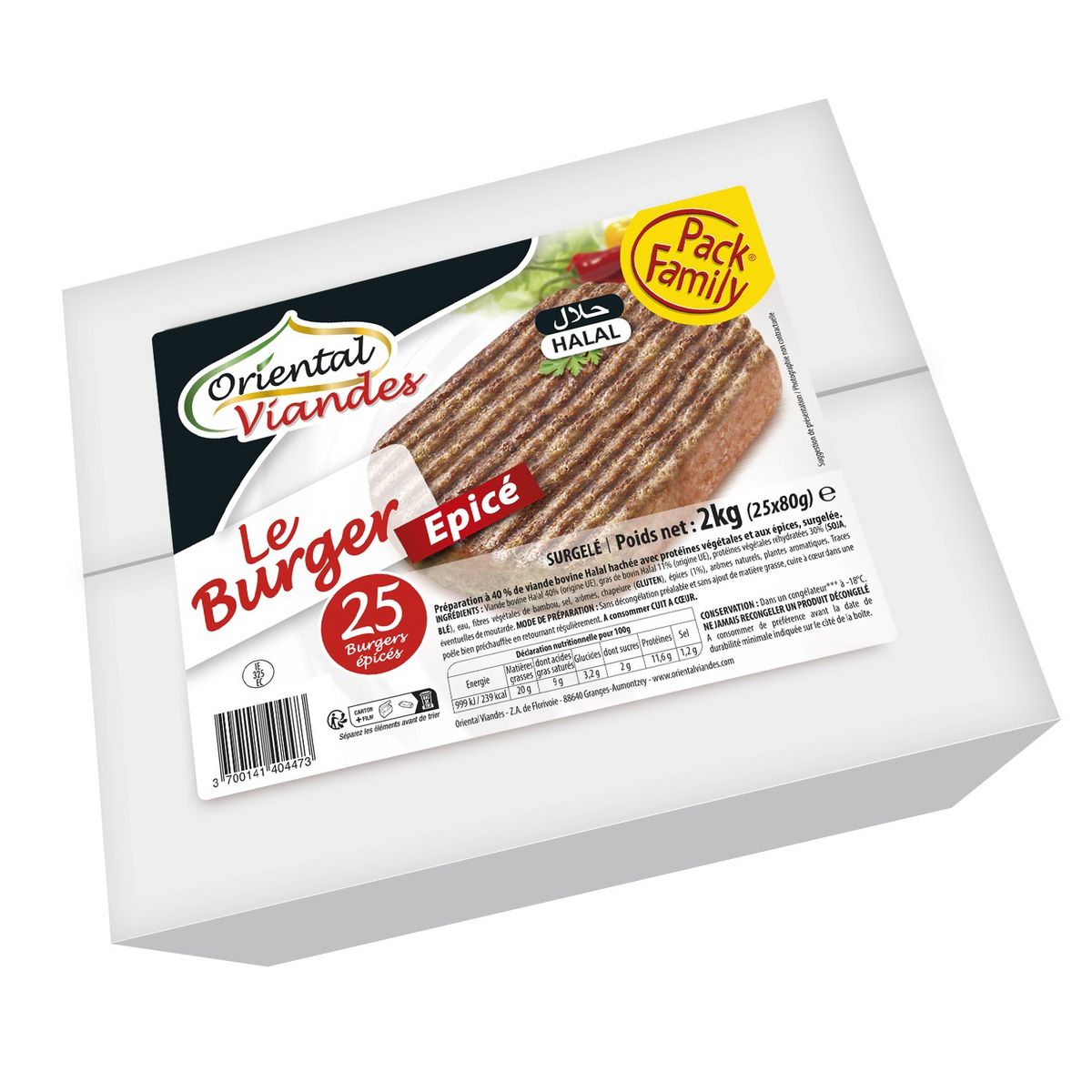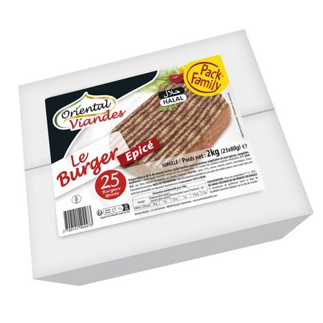 Le burger de boeuf épicé surgelé halal 20% MG (25x80g) 2kg Pack Family Oriental Viandes