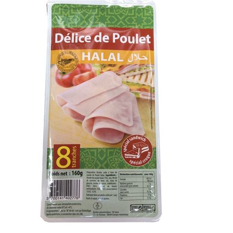 Viande de poulet 75% halal (origine Hors UE), eau, fécule de pomme de terre, sel, sirop de glucose, herbes et épices, stabilisateurs : E407 et E451, extrait de levure, antioxydants : E301 et E331, conservateur : E262 et E250.