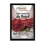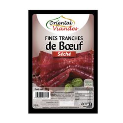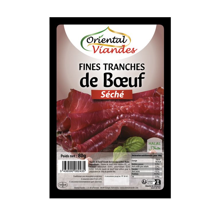 Viande de boeuf halal (origine UE), sel, dextrose, antioxygène E301 et conservateur E252. 174g de viande pour 100g de produit fini.
