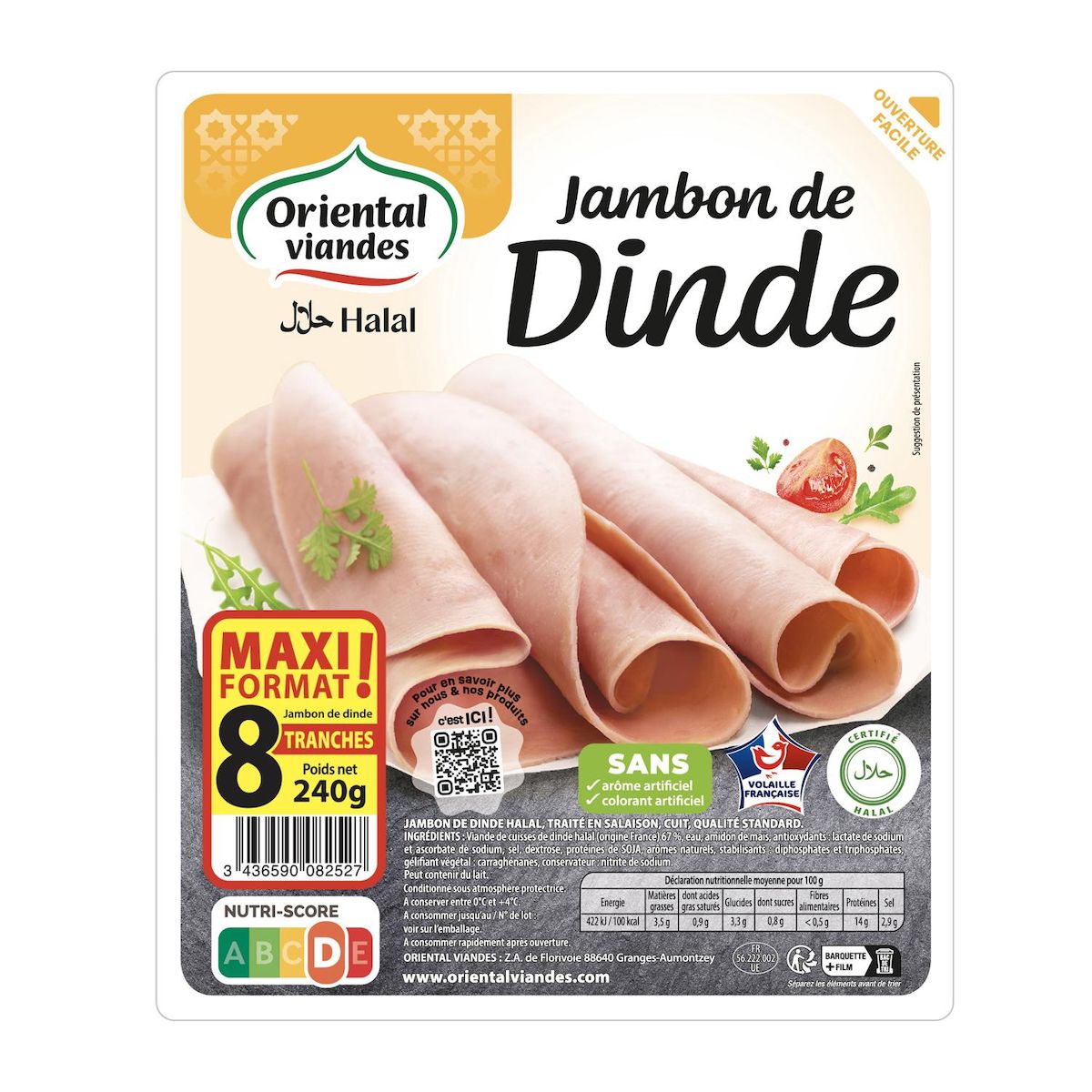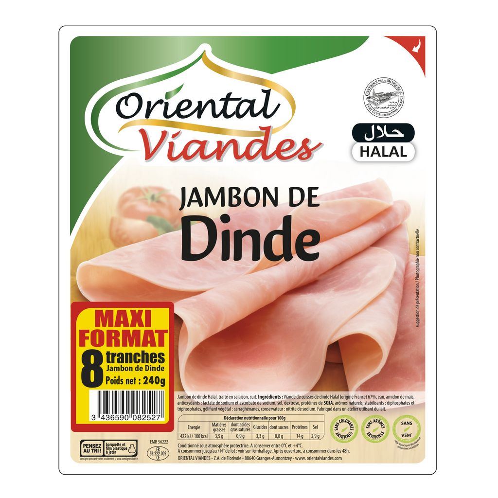 Viande de cuisse de dinde halal 67% (origine France ), eau, amidon de maïs, antioxydants : lactate de sodium et ascorbate de sodium, sel,dextrose de blé, protéines de SOJA, arômes naturels, stabilisants : diphosphates et triphosphates, gélifiant : carraghénanes, conservateur : nitrite de sodium