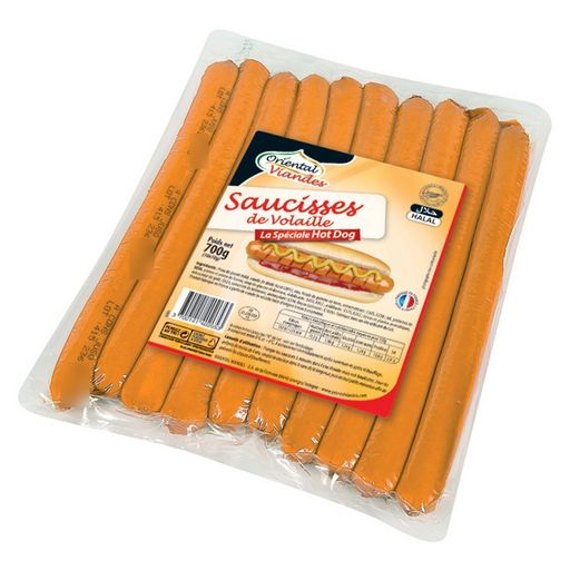 peau de poulet halal (origine UE), viande de dinde halal 28% (origine UE), eau, fécule de pomme de terre, conservateurs : E325, E250, sel, protéines de SOJA, arômes et arôme de fumée, sirop de glucose et dextrose, stabilisants : E450, E452, acidifiants : E575, E262, épices et plantes aromatiques, exhausteur de goût : E621, concentré de betterave, antioxydant : E316, boyau (colorant E160b). Traces éventuelles de LAIT.