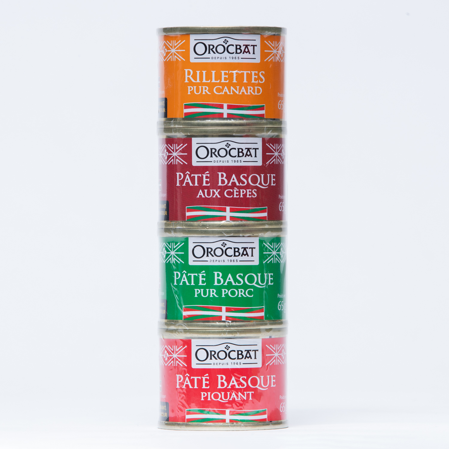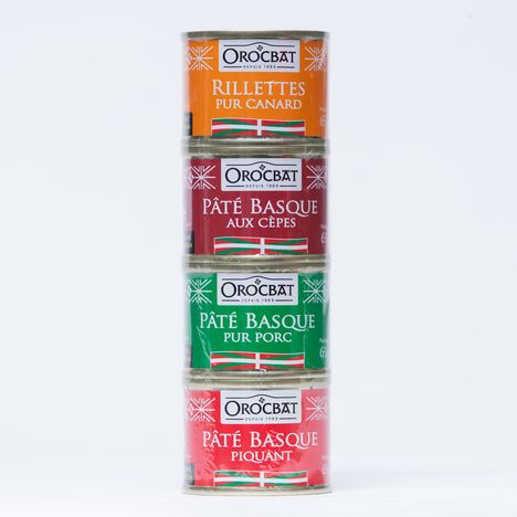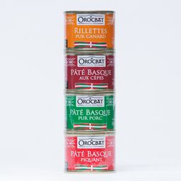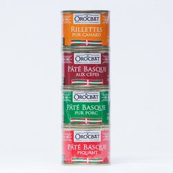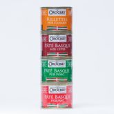 Le Souletin : un lot pour découvrir des pâtés basques originaux ! Il se compose de 4 boites de 65g chacune : le pâté basque pur porc, le pâté basque piquant, le pâté basque aux cèpes et les rillettes pur canard.