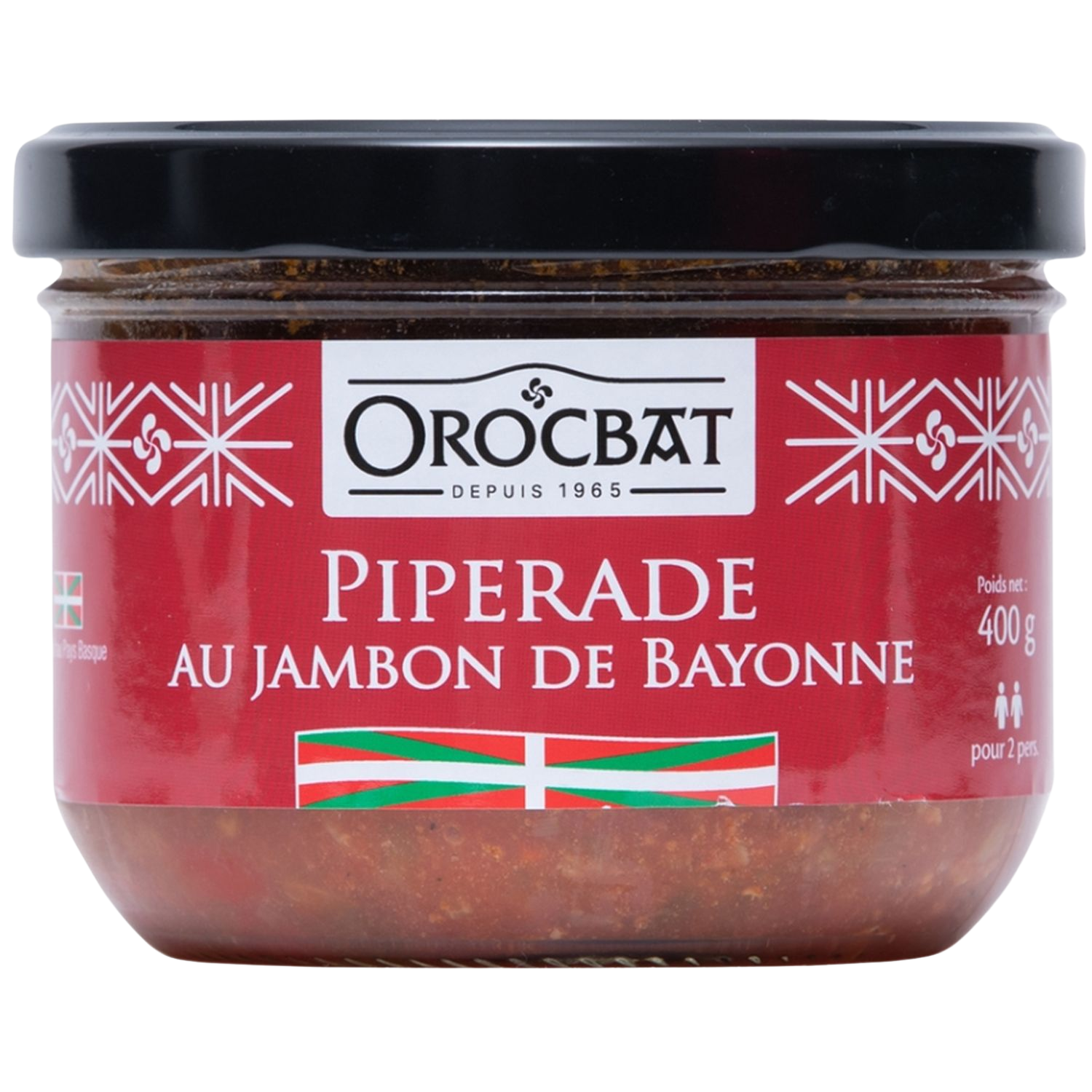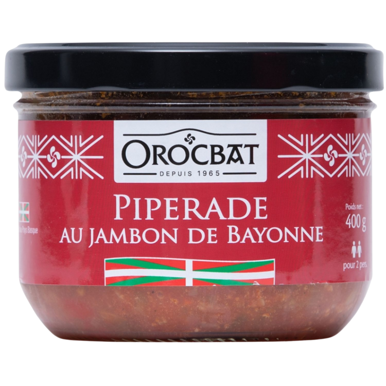 Tomates, poivrons verts, oignons, poivrons rouges, jambon de Bayonne (6%) (cuisse de porc, sel de Salies de Béarn, sucre, conservateur : salpêtre), eau, ail, sucre, sel, poivre, piment d’Espelette (0.05%)