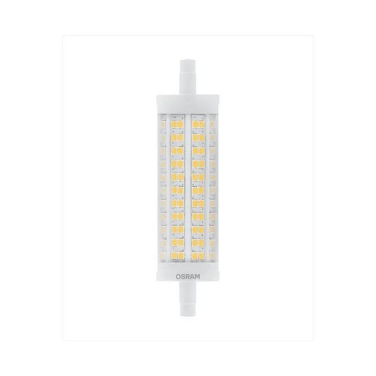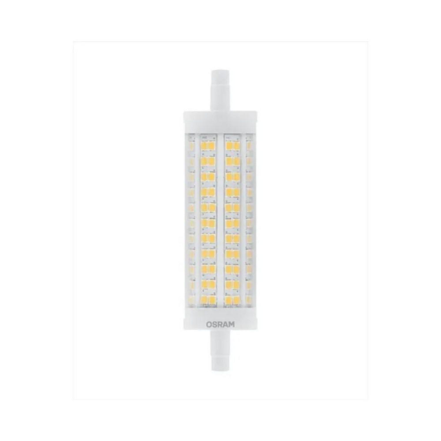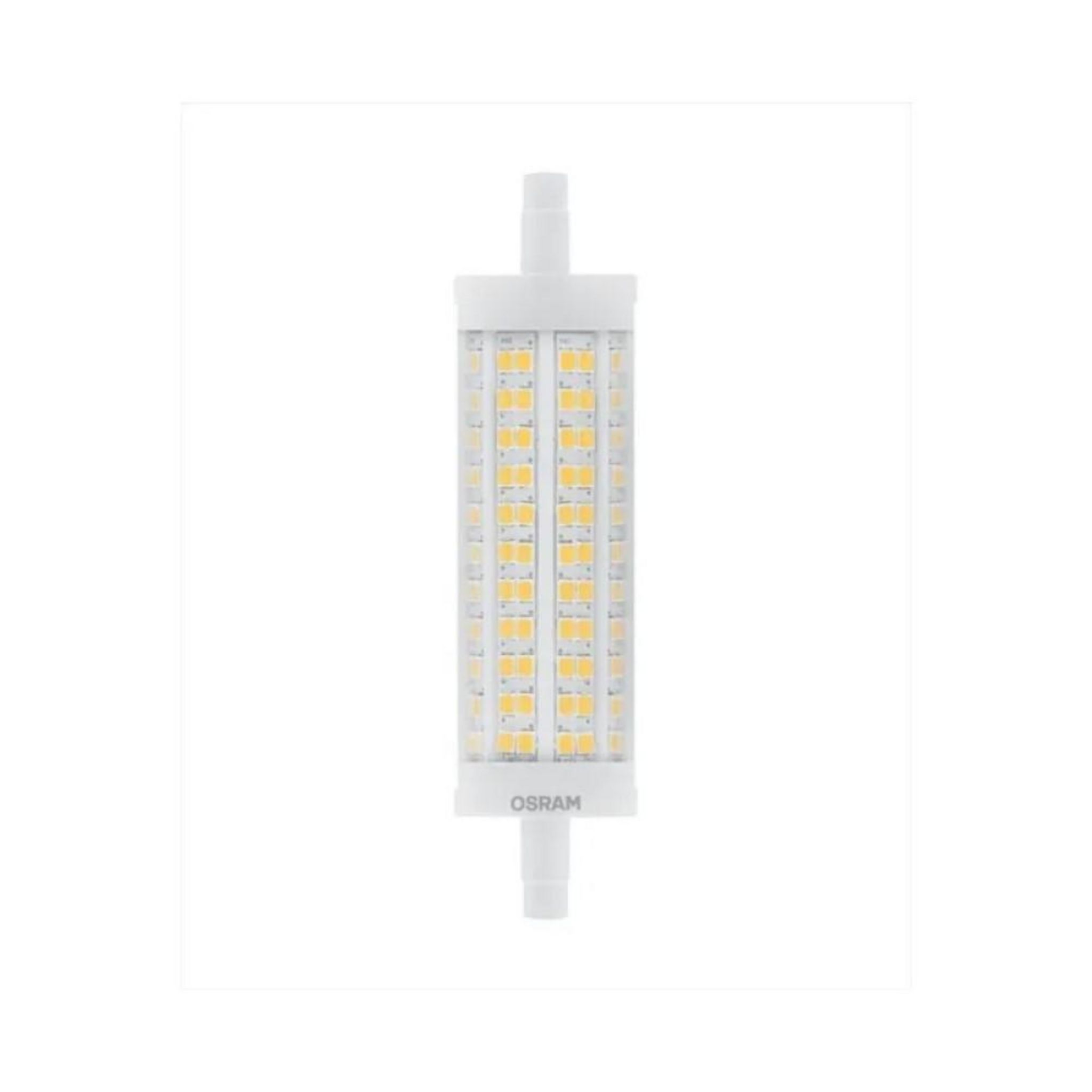Ampoule LED OSRAM tubulaire, culot R7s, consomme 17,5W équivalent 150W, 118 mm, 2452 lumens, 118mm, lumière blanc chaud 2700K, finition claire, intensité variable, éclairage instantané, durée de vie 25000h, garantie 4 ans, alte énergétique E