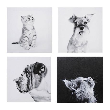 Ensemble de 4 tableaux sur toile imprimée 28x28 cm FunnyTrès joli ensemble de 4 tableaux sur toile imprimée de format carré Funny à l'imprimé noir et blanc. Ces tableaux sur canevas avec structure en bois de dimensions 28x28 cm orneront le mur d'agréables photos d'animaux domestiques.Informations su