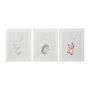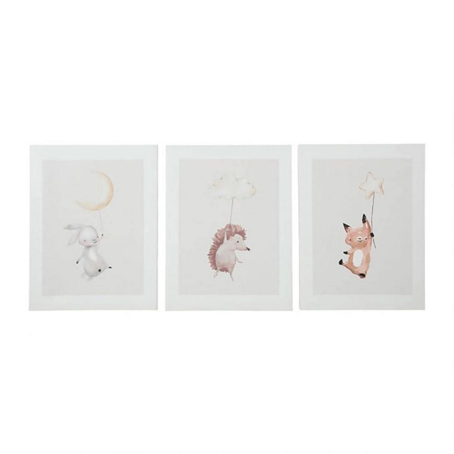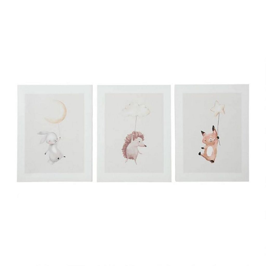 Lot de 3 tableaux toile Doudous 30x40 cmTrès joli ensemble de 3 tableaux toile imprimée Doudous pour chambre d'enfant. Ces jolis tableaux sur toile avec structure en bois de dimensions 30x40 cm orneront le mur d'un agréable dessin doux et amusant. 3 dessins différents : renard, hérisson et lapin.Informations sur le lot de 3 tableaux toile Doudous 30x40 cm :Dimensions : L. 30 x H. 40 cmMatière : MDF, textilePoids d'un tableau : 240 g