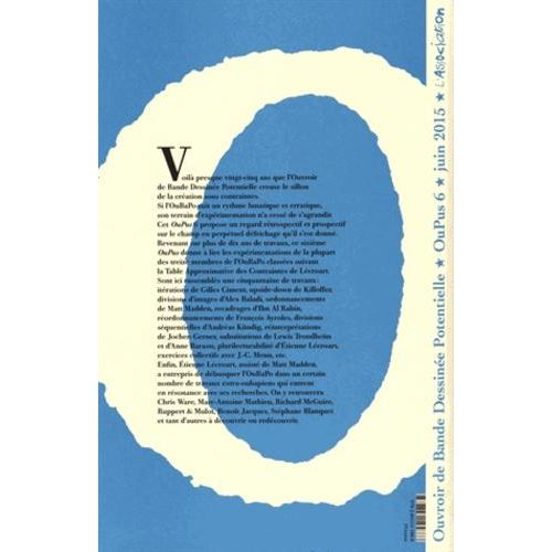 Voilà presque vingt-cinq ans que L'Ouvroir de Bande Dessinée Potentiel creuse le sillon de la création sous contraintes. Si l'OuBaPo suit un rythme lunatique et erratique, son terrain d'expérimentation n'a cessé de s'agrandir. Cet Oupus 6 propose un regard rétrospectif et prospectif sur le champ en perpétuel défrichage qu'il s'est donné. Revenant sur plus de dix ans de travaux, ce sixième Oupus donne à lire les expérimentations de la plupart des treize membres de l'OuBaPo altés suivant la Table Approximative des Contraintes de Lécroart. Sont ici rassemblés une cinquantaine de travaux : itérations de Gilles Ciment, upside-down de Killoffer, divisions d'images d'Alex Baladi, ordonnancements de Matt Madden, recadrages d'Ibn Al Rabin, réordonnancements de François Ayroles, divisions séquentielles d'Andréas Ku ? ndig, réinterprétations de Jochen Gerner, substitutions de Lewis Trondheim et d'Anne Baraou, plurilecturabilité d'Etienne Lécroart, exercices collectifs avec J. -C. Menu, etc. Enfin, Etienne Lécroart, assisté de Matt Madden, a entrepris de débusquer l'Oubapo dans un certain nombre de travaux extra-oubapiens qui entrent en résonance avec ses recherches. On y retrouvera Chris Ware, Marc-Antoine Mathieu, Richard McGuire, Ruppert &Mulot, Benoît Jacques, Stéphane Blanquet et tant d'autres à découvrir ou redécouvrir.
