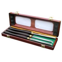 Lame acier HSS. Manche 250 mm en bois avec virole laiton. Composition : 1 gouge à profiler 10 mm/1 grain d'orge pointu 5 x 15 mm/1 ciseau à tranchant oblique 15 mm