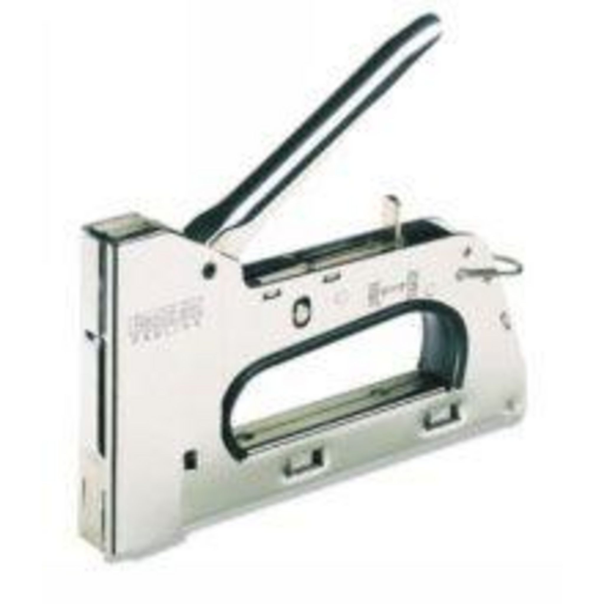 Agrafeuse Pro R34. Corps métal chromé. Puissance de frappe réglable. Recommandée pour la fixation des revêtements plastiques, matériaux d'isolation, moquettes,... Utilise des agrafes n° 4 - 11 ou 140 de 6 à 14 mm.