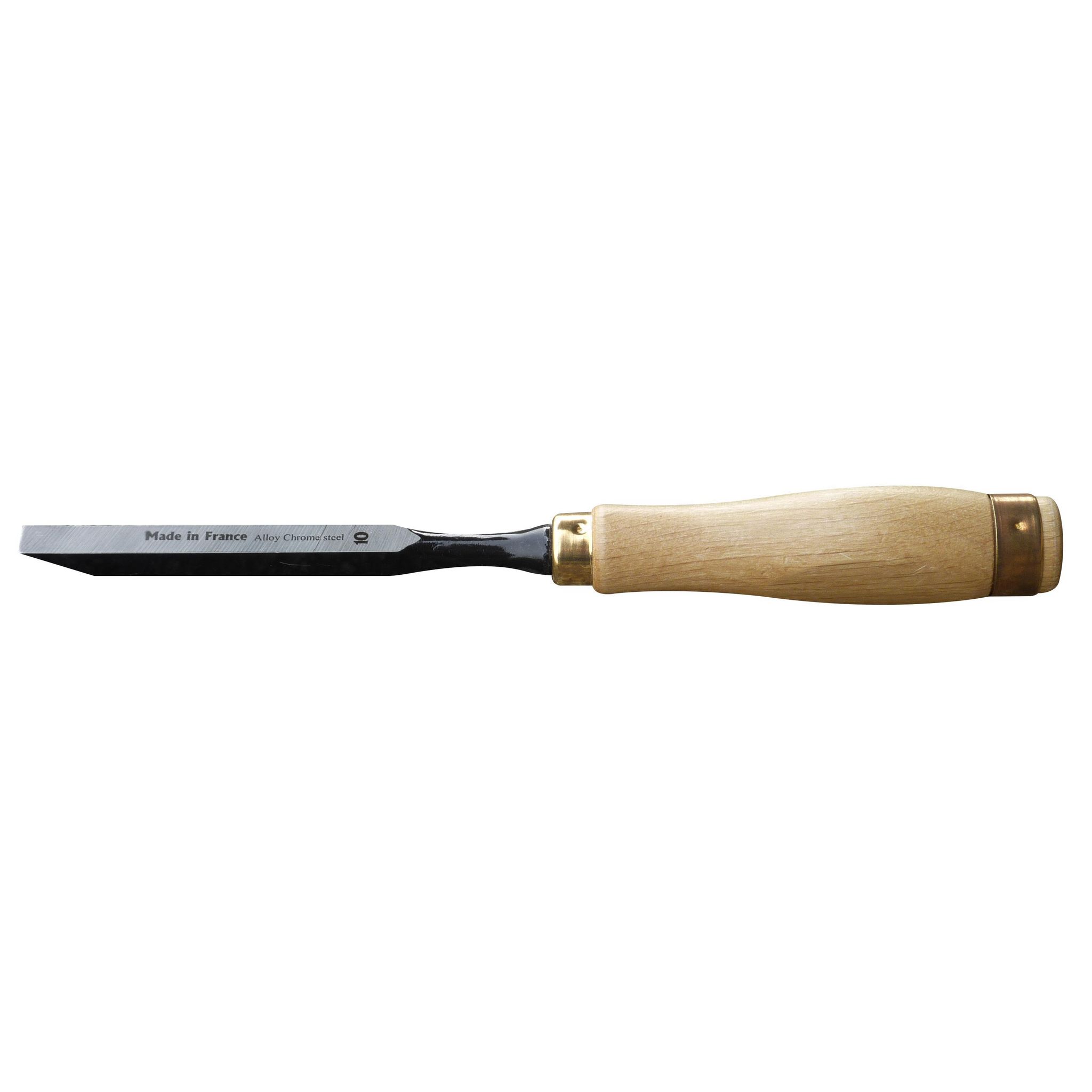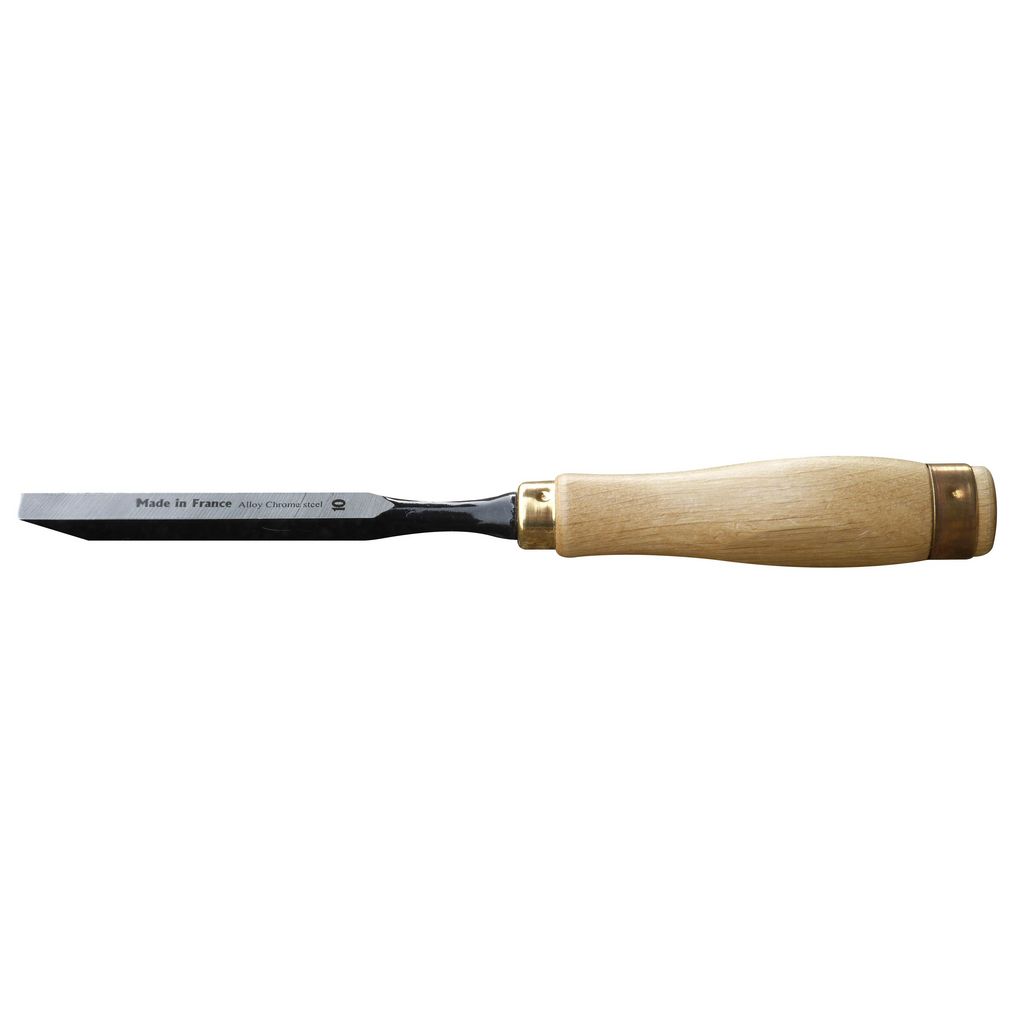 Bedane de menuisier avec lame acier au chrome trempée et affûtée en bout. Manche en bois à double virole laitonnée. Fabrication française.Largeur : 12 mm