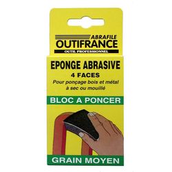 Eponge abrasive. Dimensions : 100 x 70 x 25 mm.Permet de poncer toutes formes sur bois et métal à sec ou à l&rsquo,eau.