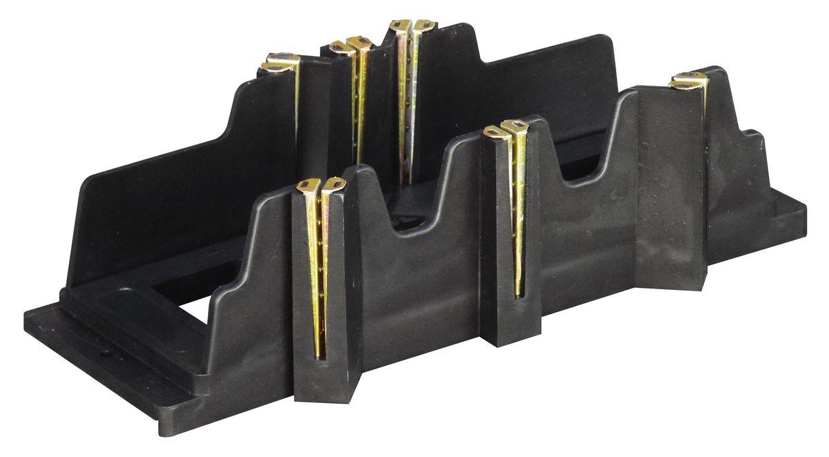 BoÎte en ABS légère et très résistante. Modèle breveté de très grande précision. Guides scie équipés de 60 billes-ressorts métalliques qui maintiennent parfaitement la scie au milieu de l'encoche pour un trait fin et un angle juste, et qui empêchent la détérioration de la boÎte. 3 coupes verticales : 45° à gauche, 90° et 45° à droite.
