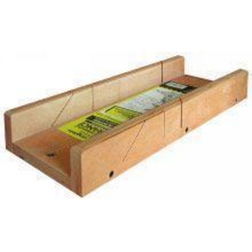 BoÎte à onglet pour plinthes. En multiplis indéformable, épaisseur 18 mm, vissée, vernie. 3 coupes, 2 angles : 45° et 90°.
