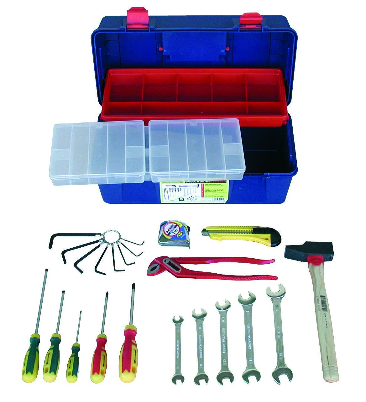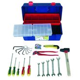 1 boîte à outils avec étage et coffretde rangement (400 x 200 x 180 mm), 1 marteau de menuisier (20 mm),1 pince multiprise (250 mm), 1 cutter 18mm, 1 mesure (3m),5 tournevis (3 plats, 2 philips), 5 clés double fourche (6 à 17 mm),8 clés mâles 6 pans (1,5 à 6 mm).