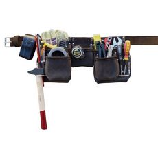 En cuir gras tanné très épais (2 mm), poches ourlées, surpiquée et rivetées très résistantes. Ceinture en cuir avec boucle métallique. Composée de 2 poches larges, de 3 poches moyennes, de 2 poches fines, de 4 logements pour tournevis, crayons, craies, et de 2 anses métalliques pour marteaux, massettes, maillets, hachettes. 11 compartiments au total permettent de ranger un grand nombre d'outils.