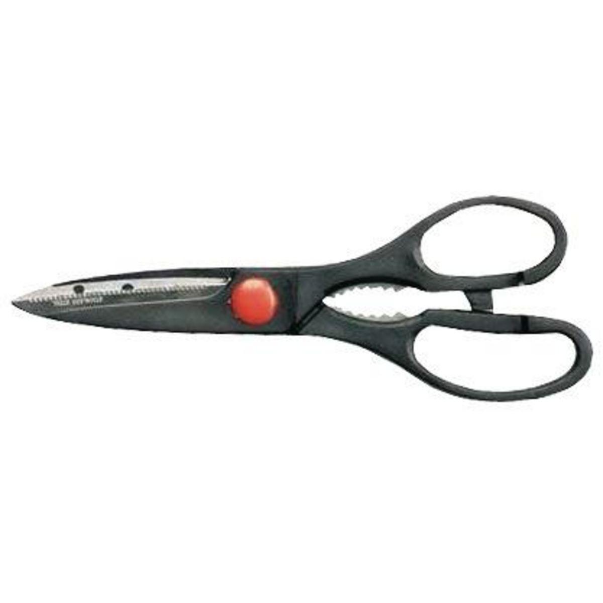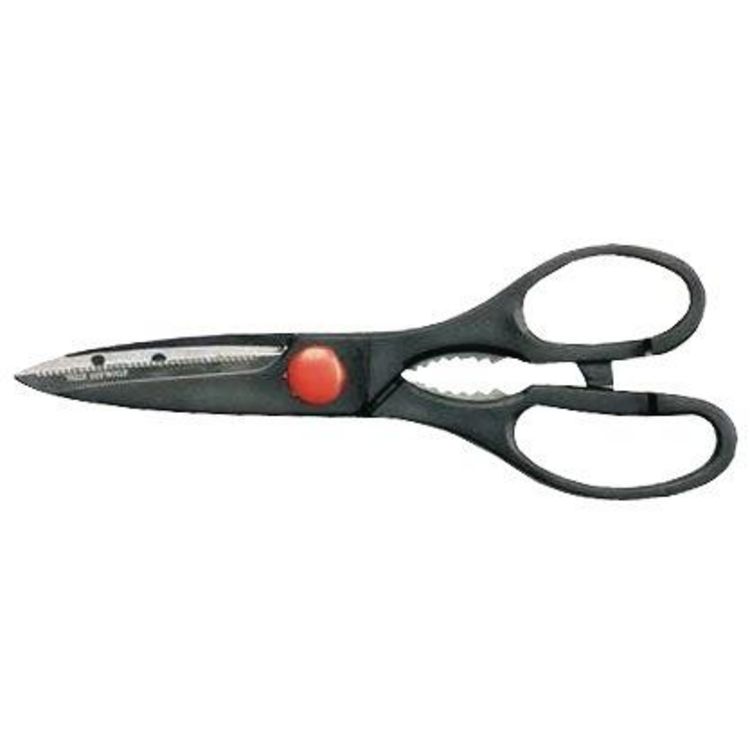 Ciseaux inox multi-usages 215 mm. Acier inox, poignée ABS.Permet la coupe de tous matériaux.Ouverture des bouchons, casse noix, etc...