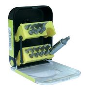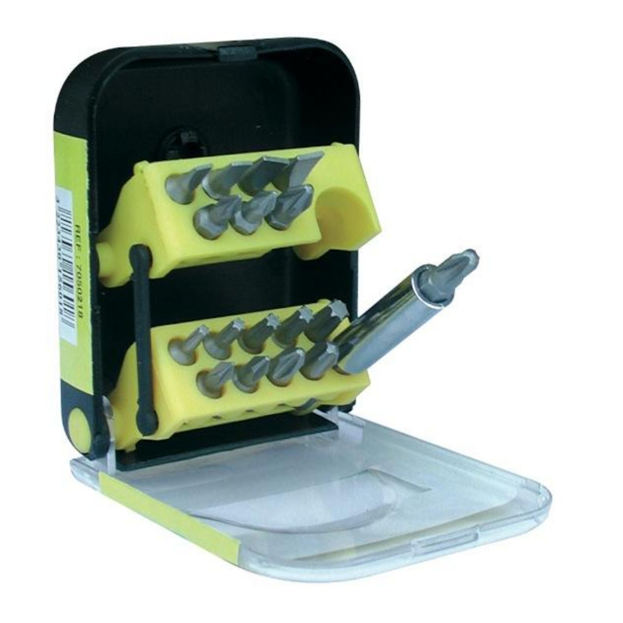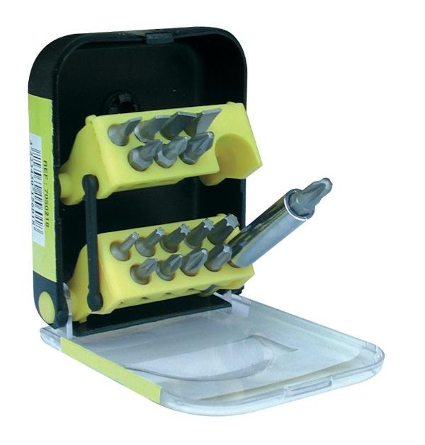 Coffret distributeur de 17 embouts de vissage chrome vanadium de 25 mm et d&rsquo,un porte-embouts magnétique de 60 mm. Plats 4-5-6-7 mm / Ph 0-1-2-3 / Pz 0-1-2-3 T 10-15-20-25-30 / porte-embouts.