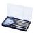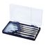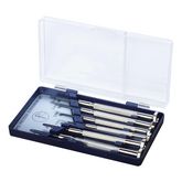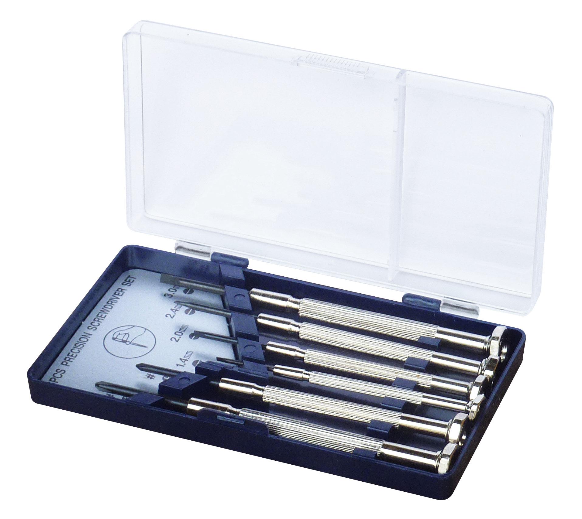 Coffret de 6 tournevis horloger en acier avec corps strié et tête pivotante repose-doigt. Livré en coffret plastique.