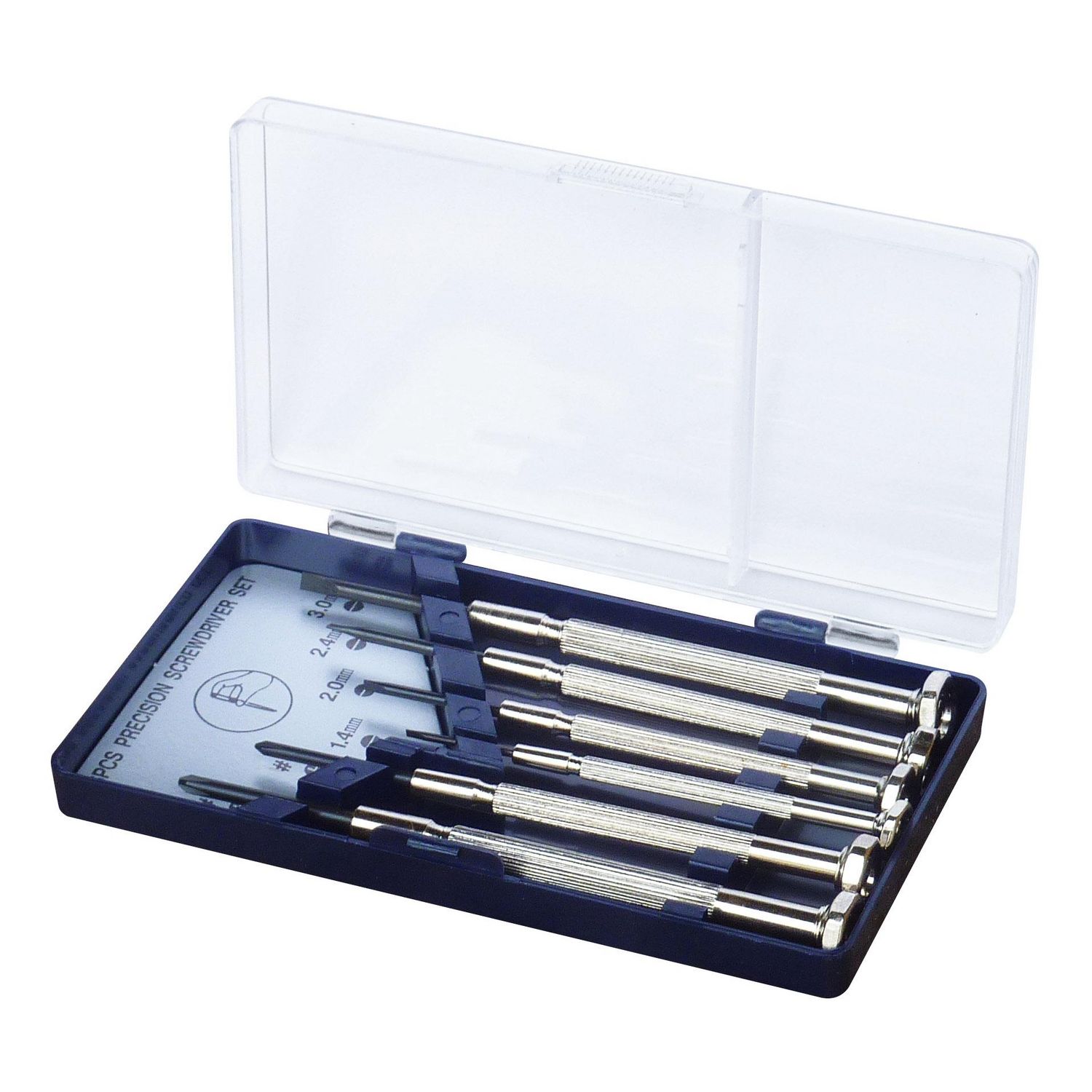 Coffret de 6 tournevis horloger en acier avec corps strié et tête pivotante repose-doigt. Livré en coffret plastique.Composition : 4 plats : 1,4 / 2,0 / 2,4 / 3,0 mm 2 Philips : n°0 / n°1.