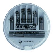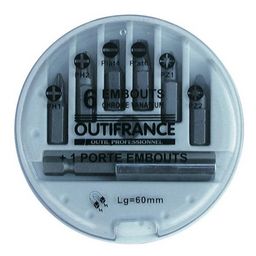 Disque distributeur de 6 embouts de vissage chrome vanadium de 25 mm et d&rsquo,un porte-embouts magnétique de 60 mm. Plats 4 et 6 mm / Ph 1 et 2 / Pz 1 et 2 / porte-embouts.