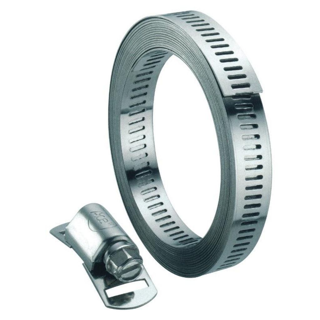Collier de serrage extra long : Bande 3 mètres - 100% inox W4 - Largeur 14 mm - Avec 6 têtes.Bande métallique ajourée de 3 mètres, livrée avec plusieurs têtes.Permet de réaliser des colliers de serrage de la longueur voulue.
