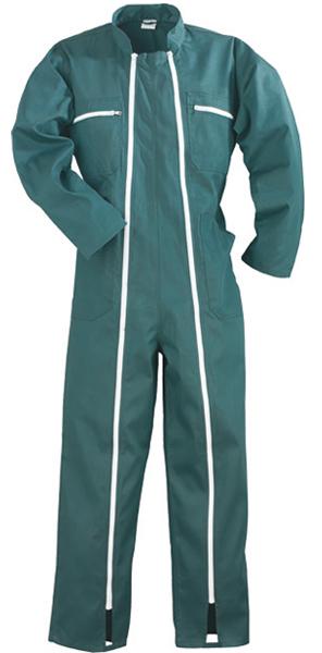 Combinaison de travail en coton et polyester, 245 g/m2. Fermeture par 2 glissières à grosses mailles sur toute la hauteur. Ceinture élastique. 5 poches au total.Couleur : verteTaille : T.5 - 56/58 - XXL