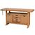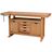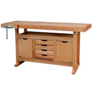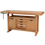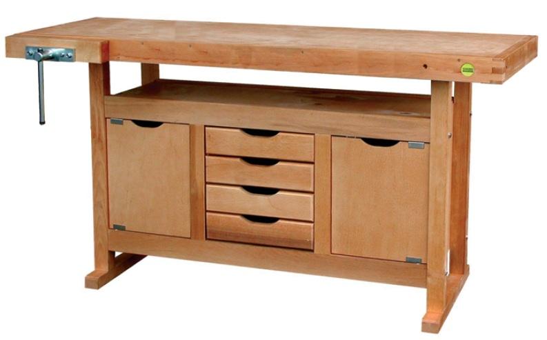 Plateau bois multiplis 25 mm avec ceinture bois massif 70 mm.Piètement de section 50 x 40 mm avec semelles.Rangements : caisson avec 4 tiroirs 340 x 310 x h 85 mm et 2 portes 290 x h 360 mm.Espace de rangement entre le plateau et le caisson.Serrage : presse avant horizontale mâchoire bois, vis acier