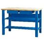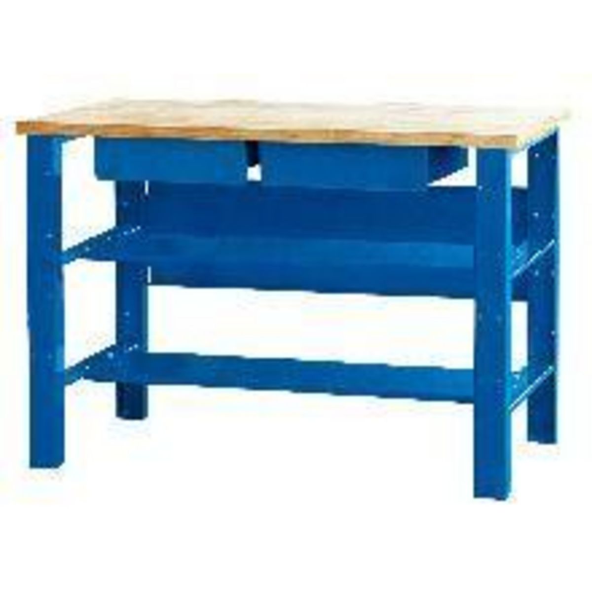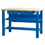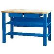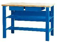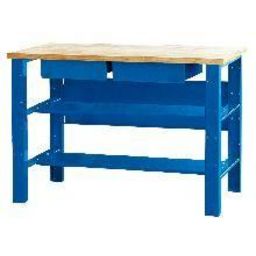 Etabli de mécanicien. Plateau bois multiplis 27 mm. 2 plateaux intermédiaires, 2 tiroirs. Pieds renforcés.