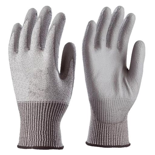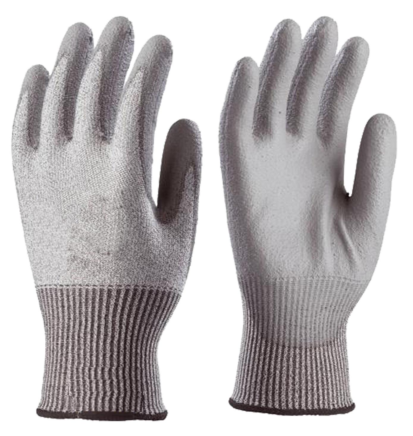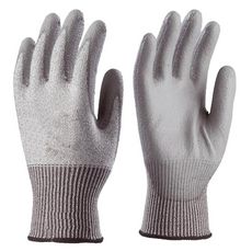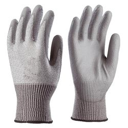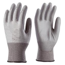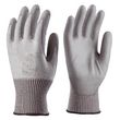 Paire de gants (taille 10) tricotés en fibres de verre et fibres synthétiques, avec paume enduite polyuréthane gris. Poignet à serrage élastique.Conformes aux normes CE EN 420 et EN 388.Indice de protection : 4542.