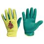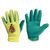 Paire de gants (taille 7) avec paume en tissus vert, dos en toile de coton jaune avec broderie et liseré de finition. Tresse élastique de serrage au poignet.Conformes à la norme CE EN 420.