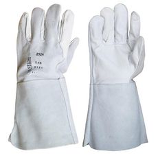 Paire de gants (taille 10) tout en cuir, paume en fleur de vachette, dos en croûte.Manchette longue 15 cm.Conformes aux normes CE EN 420 et EN 388.Indice de protection : 2121.Conformes à la norme CE EN 407.Indice de protection : X1XX2X.