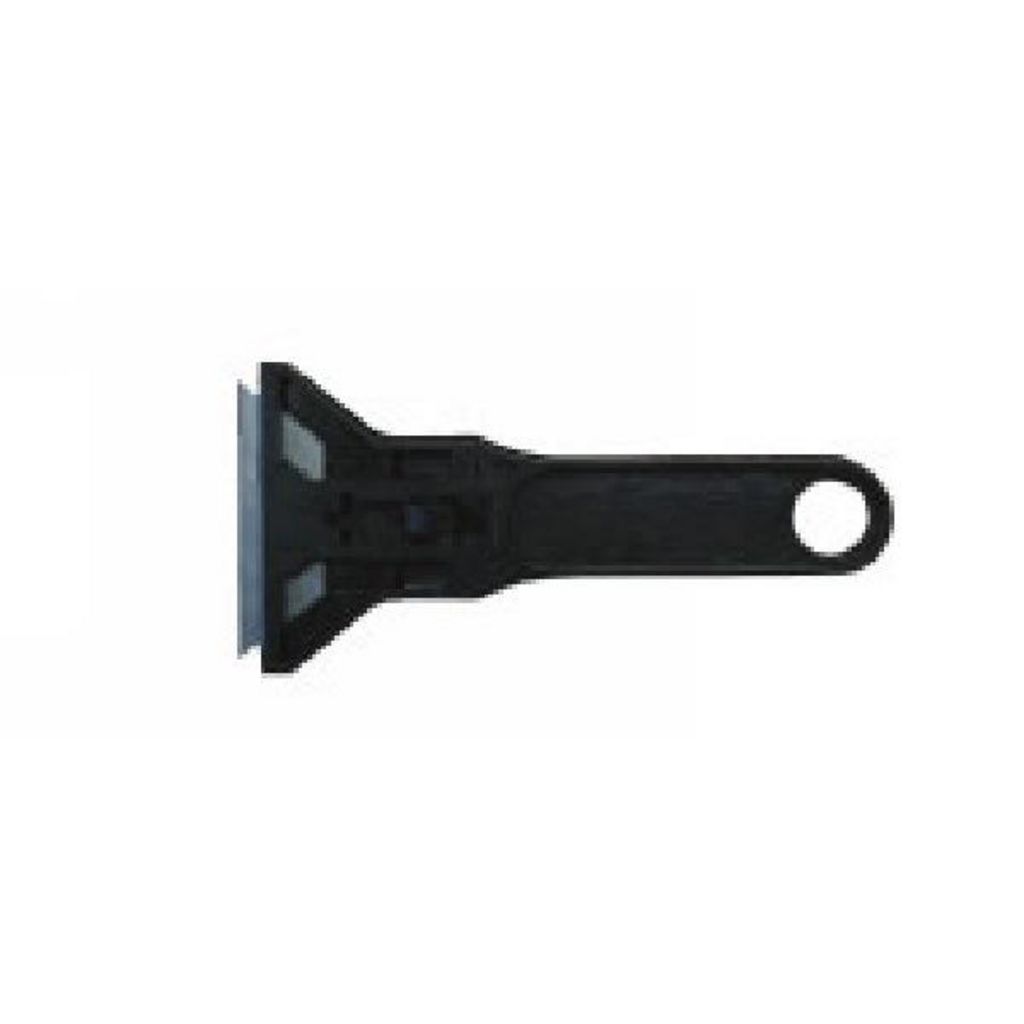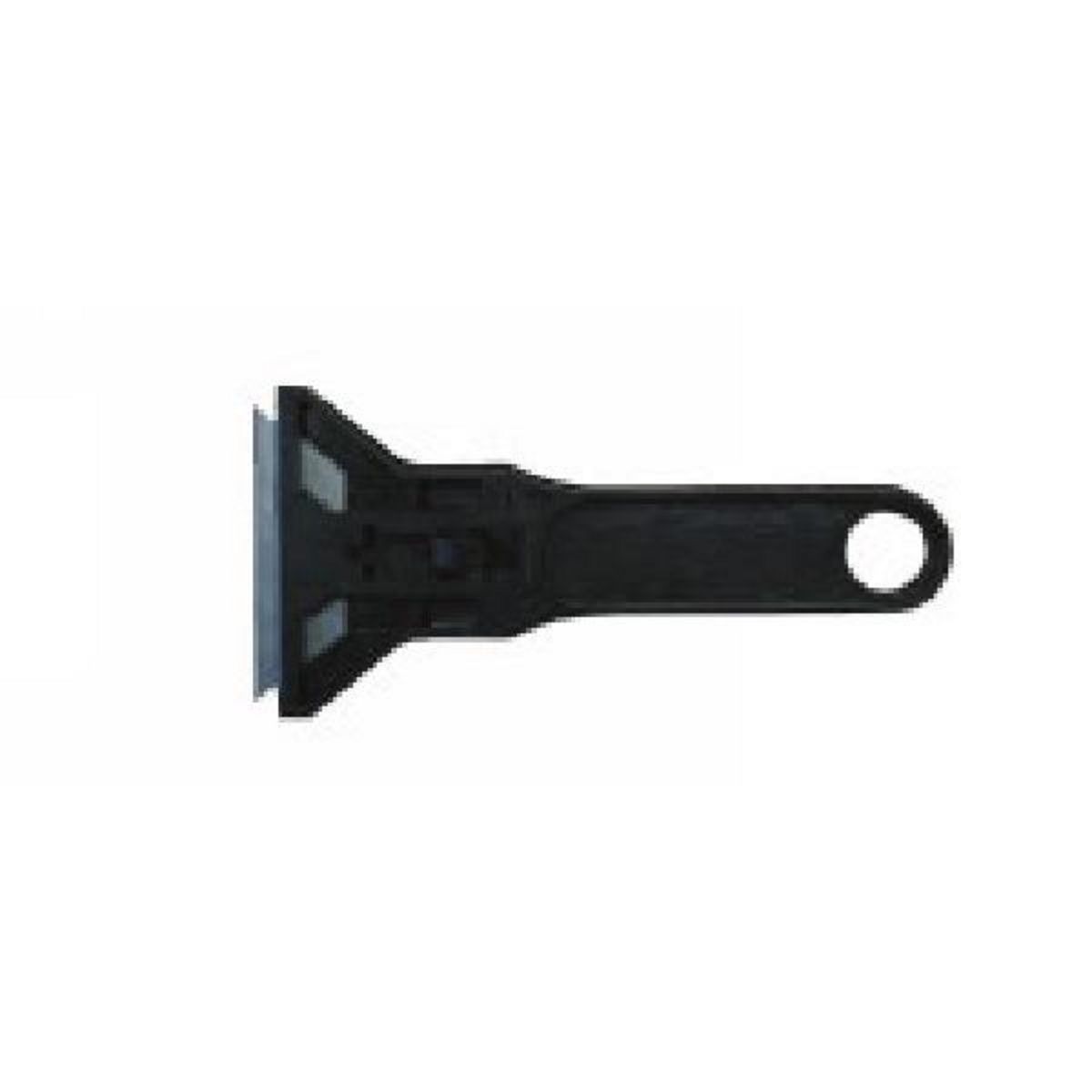 En plastique, utilise des lames trapèze avec trou central.Lame retractable.