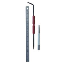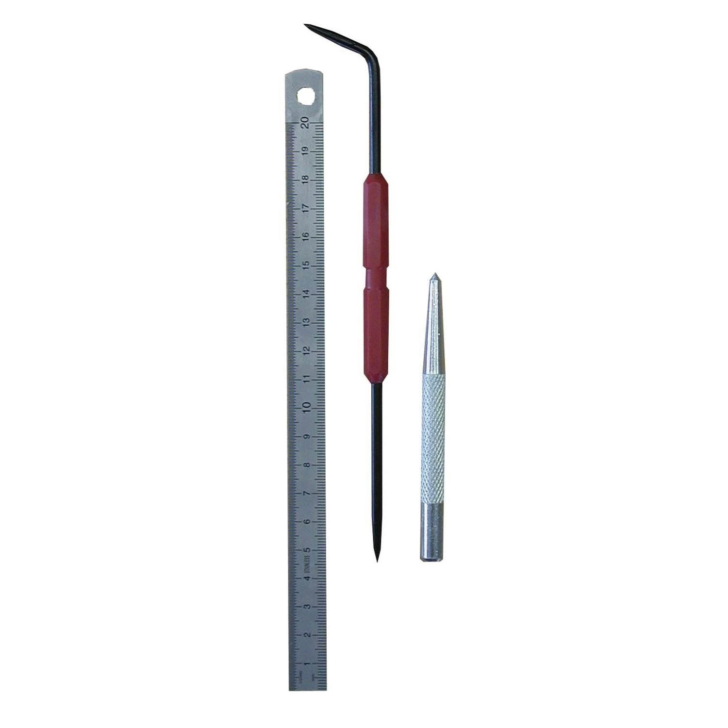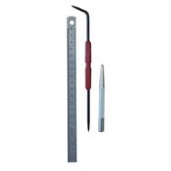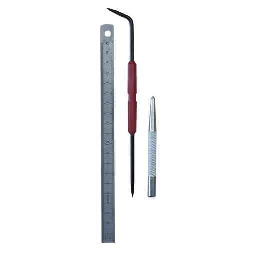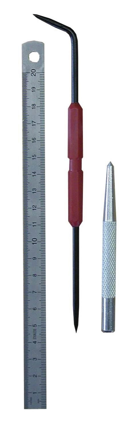 Le kit mécanicien comprend 1 reglet inox 20 cm + 1 pointeau + 1 pointe à tracer.