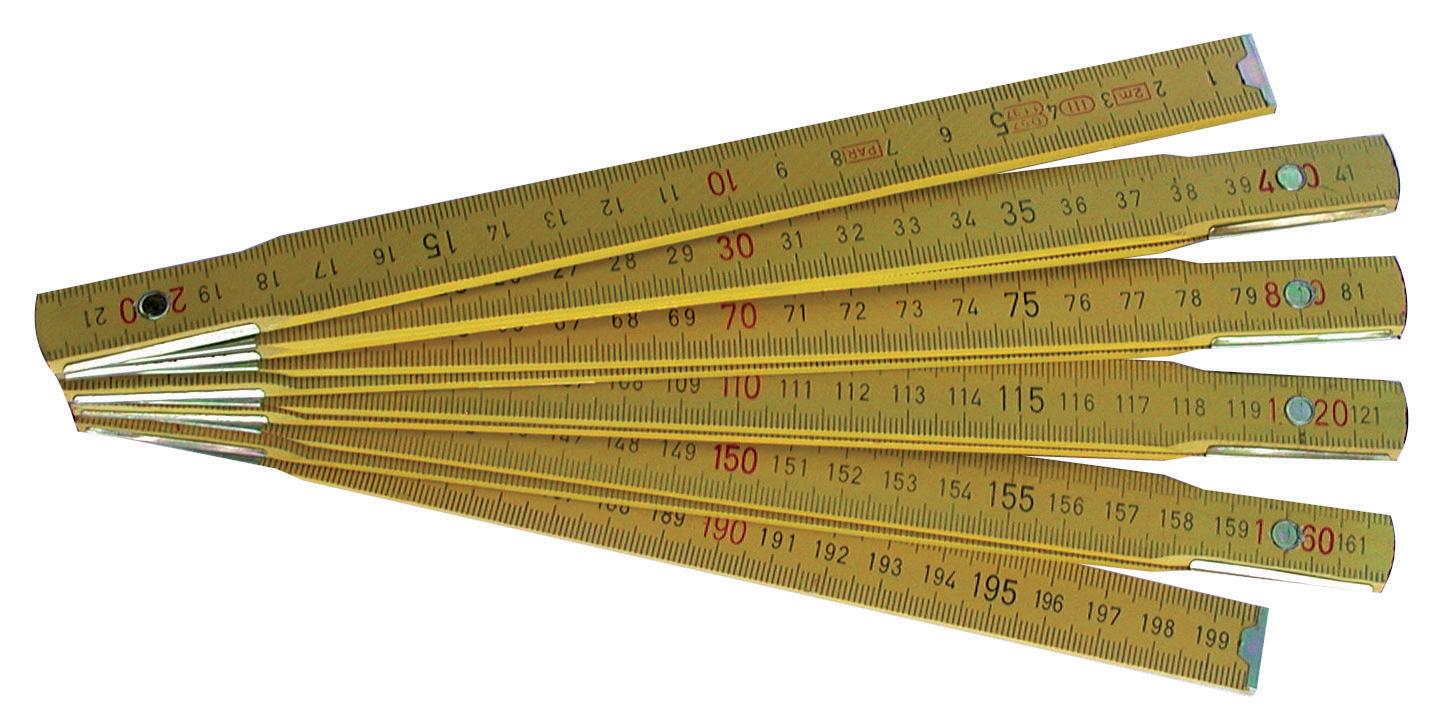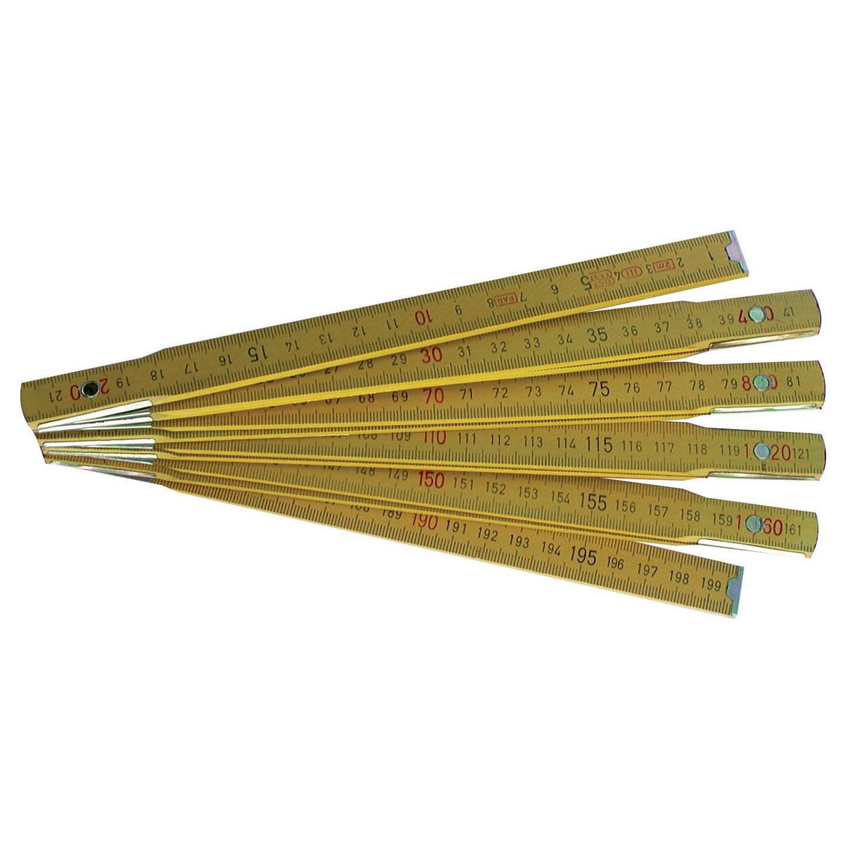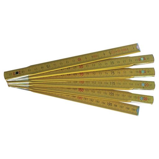 Mesure pliante en bois avec graduation en millimètres recto/verso, dizaines rouges. Ressorts antirouille.Longueur : 2 m